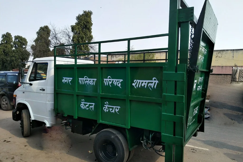 A Cattle Catcher Vehicle is a specially designed utility vehicle used by municipal corporations, animal control departments, and rescue teams to safely capture, transport, and relocate stray or unattended cattle from urban and rural areas. With increasing incidents of stray cattle obstructing roads, causing accidents, or damaging property, these vehicles provide a humane and systematic approach to animal management. Built on a robust chassis, the cattle catcher is equipped with a front-mounted cage or hydraulic-operated barrier system that helps safely trap the animal without causing harm. The rear section is designed for safe transportation, ensuring adequate ventilation and protection for the animal during transit.